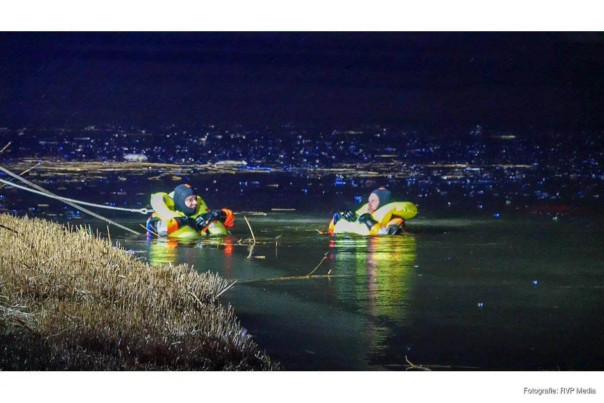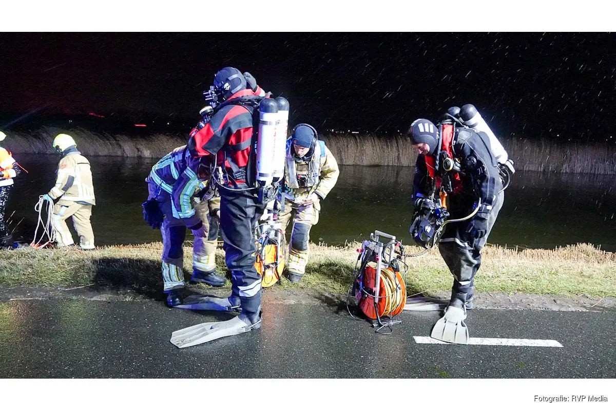 De brandweer is momenteel nog steeds in het water aan het zoeken. Van de auto zijn alleen nog de lichten te zien in het water.